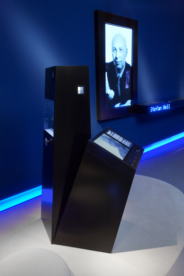 Die Innovation wurde in einem Kubus, der mit Gucklöchern ausgestattet war, dargestellt. Sie sollten die Besucher*innen neugierig auf diesen neuen Mikrokosmos machen. Durch sie wurde der Blick auf mikroskopisch dünne Schichtsysteme und winzige Magnetfeldsensoren eröffnet.