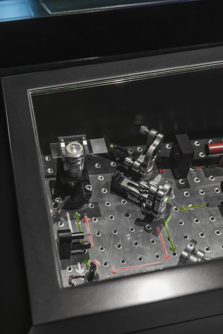 Mit einer interaktiven Animation sehen die Besucher sehr realistisch den enormen Unterschied in der Darstellung durch die STED-Mikroskopie. Auf dieser ruhen die Hoffnungen der Wissenschaft, insbesondere der Medizin, feinste Details der Vorgänge in lebenden Zellen sichtbar machen zu können. Das verspricht grundlegend neue Einsichten in die molekularen Ursachen von Krankheiten und die Wirkung von Medikamenten. Bereits 2007 wurden erste Geräte, hergestellt vom Traditionsunternehmen Leica, in den Markt gebracht. Und welche persönlichen Eigenschaften für Innovationen notwendig, ob Mut oder Fleiß wichtiger sind, auch darüber spricht Professor Hell in den Statements.
