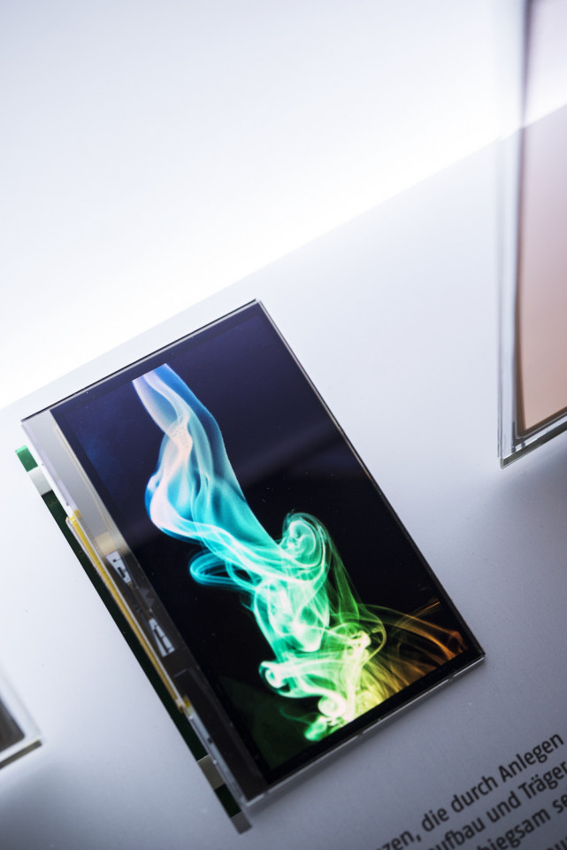 In einer großen Wandinstallation können die Besucher*innen anhand eines Licht-Panels aus OLEDs interaktiv eine Licht-Show gestalten und so die verschiedenen Eigenschaften der OLED-Materialien erleben. Im Modul werden die chemischen Grundlagen, die Effizienz durch Dotierung die neuen Produktionstechniken und die Materialität der OLED ausführlich dargestellt und mit einer Demonstration deren Wirkung belegt. Die Statements der Preisträger beleuchten deren Lebenswege und die Erfahrungen, die sie bei der Umsetzung der Idee in ein Produkt durch die Etablierung von zunächst Start-ups und dann die Strukturierung von Unternehmen gemacht haben.