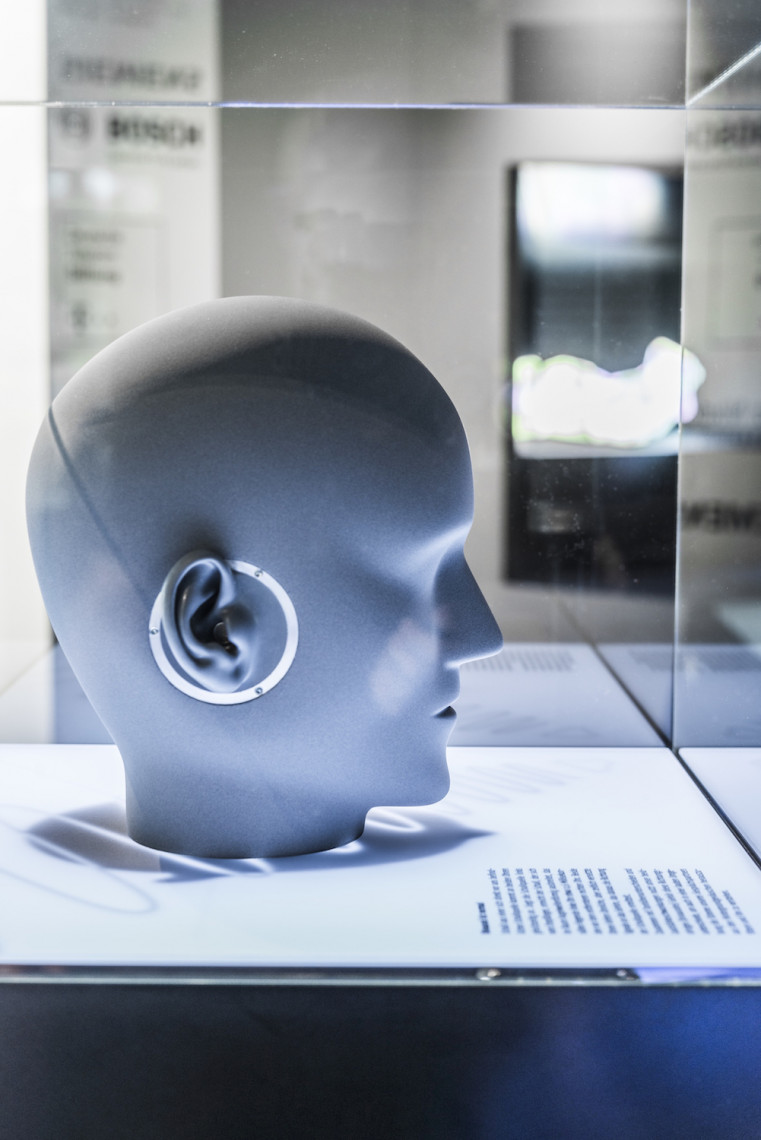 Überragt werden die Vitrinen des Moduls plakativ von einem Kunstkopf, der in der Forschung zu Hörmessungen verwandt wird.