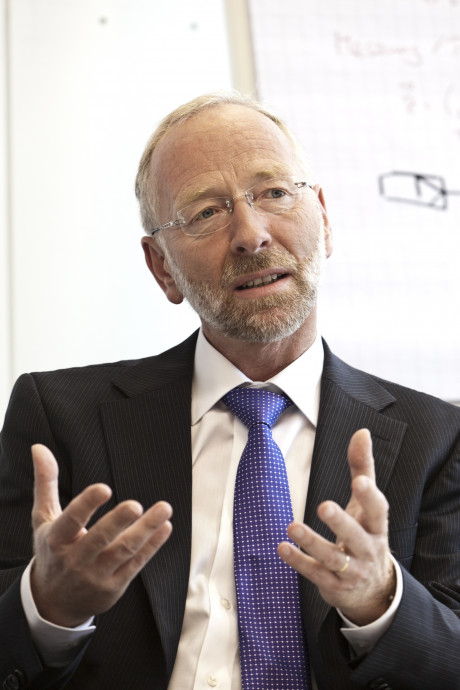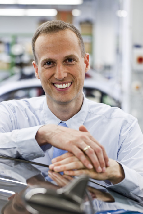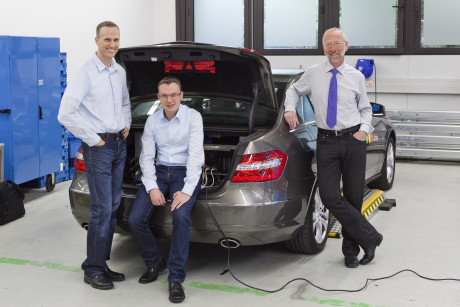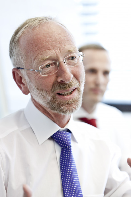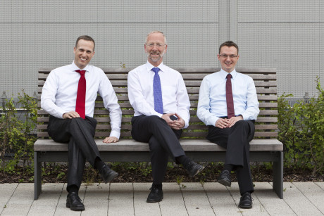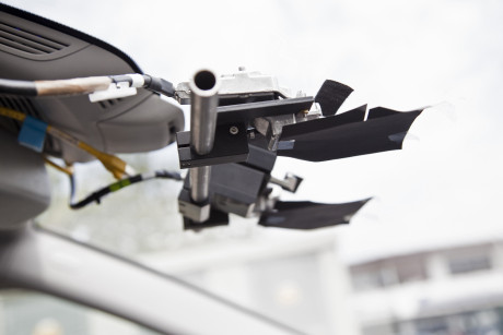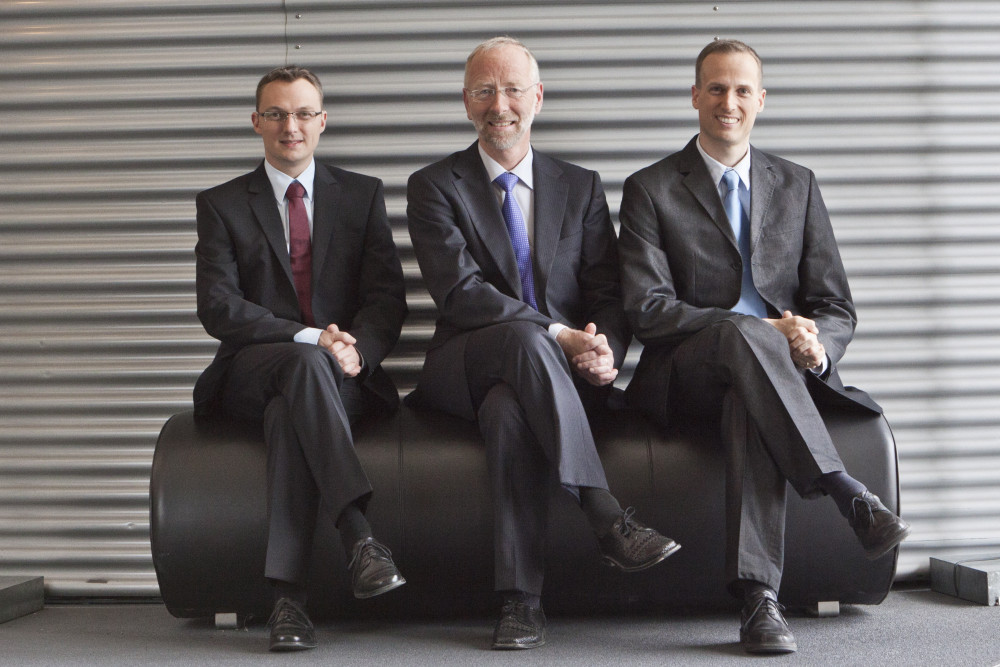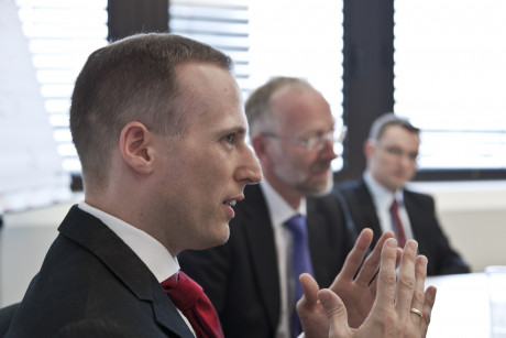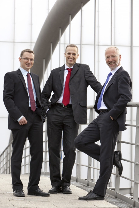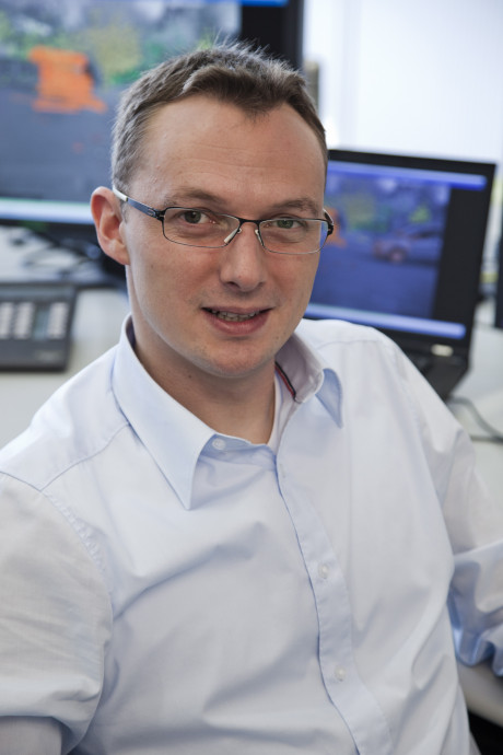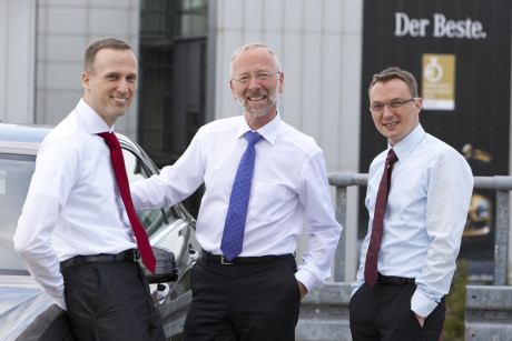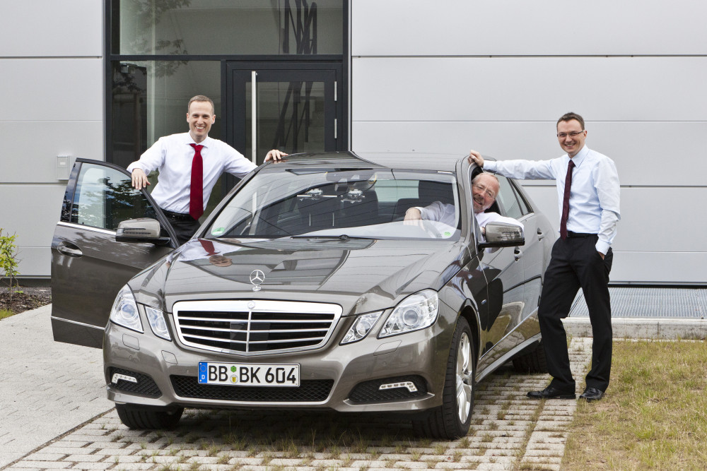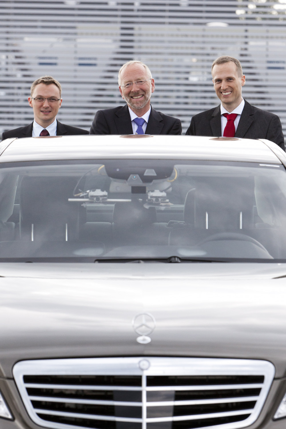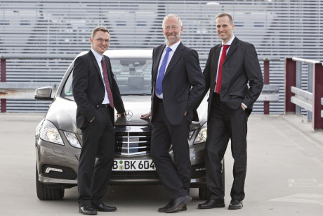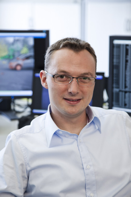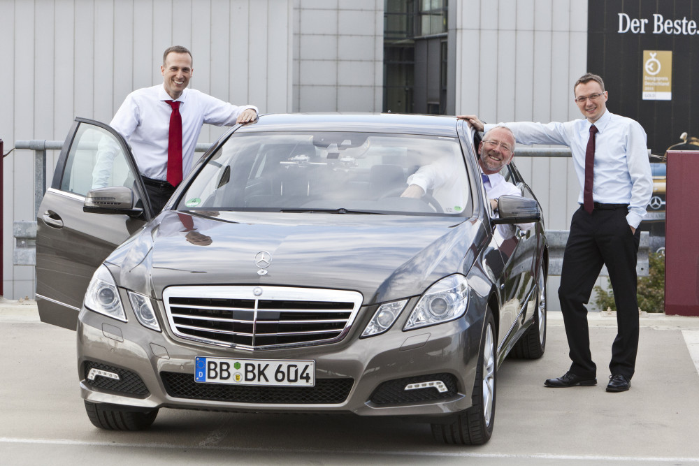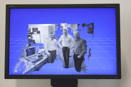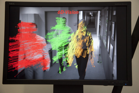 Ergebnis des 6D-Vision Verfahrens: Die Farbe kodiert die Entfernung der analysierten Punkte von Rot (nah) über Gelb zu Grün (weit entfernt). Die Pfeile zeigen auf die prädizierte Position in 0,5 Sekunden. Von links nach rechts: Dr.-Ing. Clemens Rabe, Dr. rer. nat. Stefan Gehrig, Dr.-Ing. Uwe Franke.