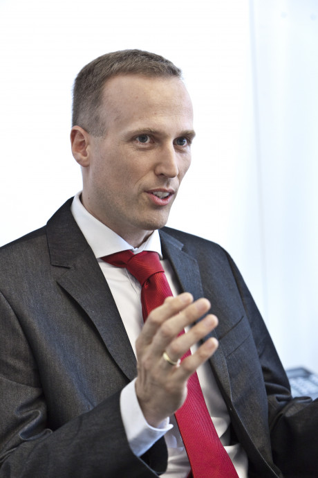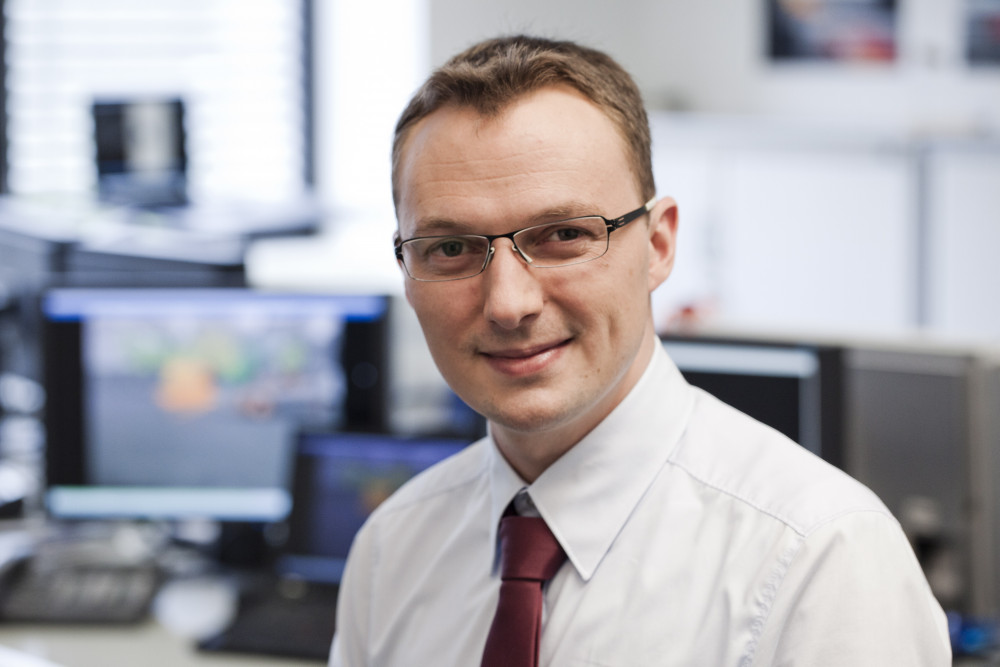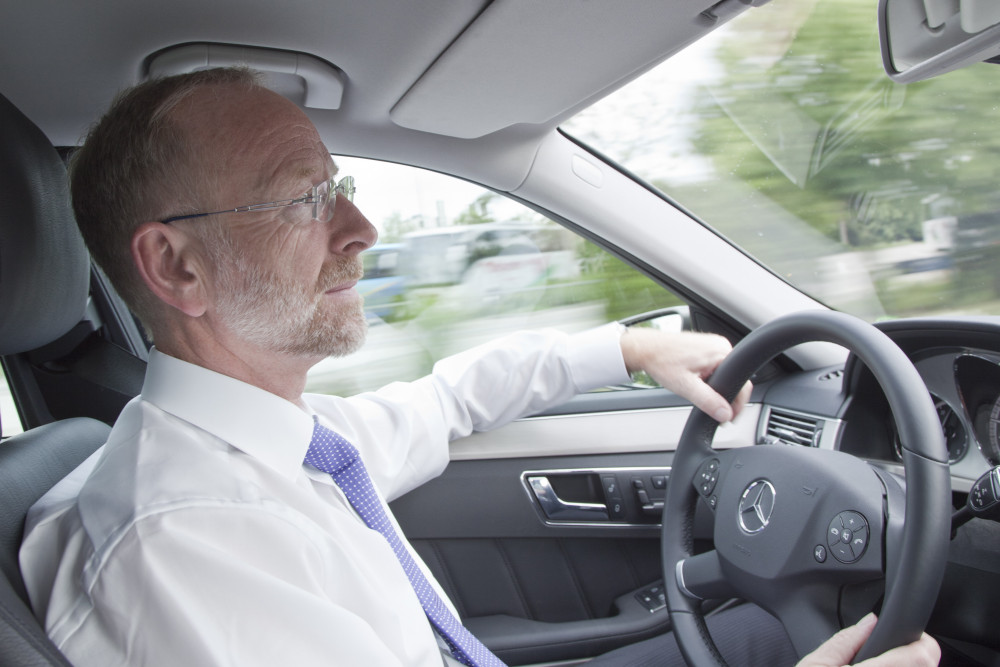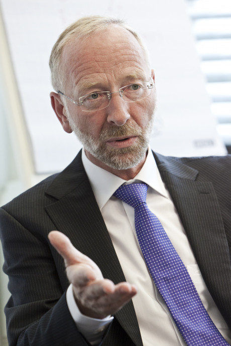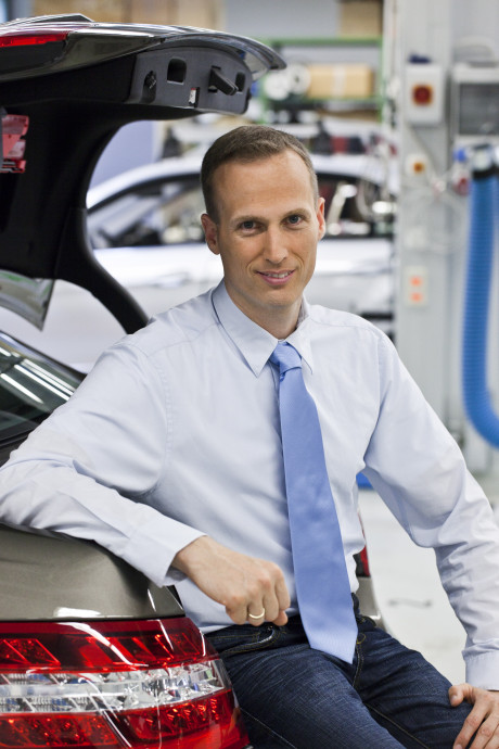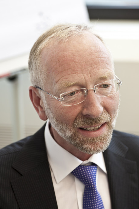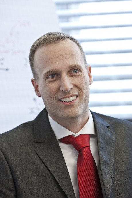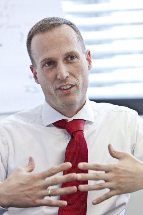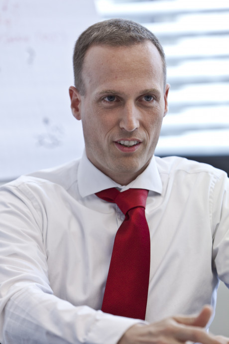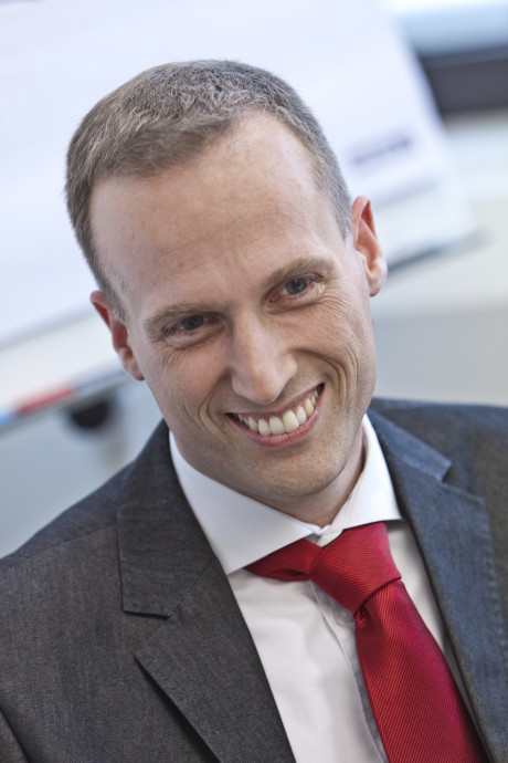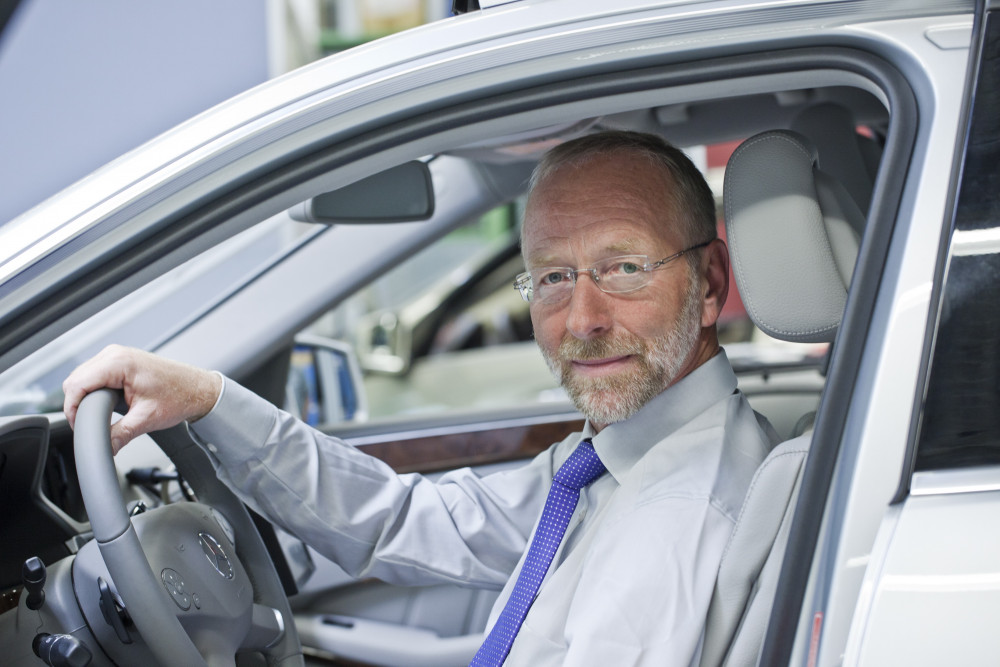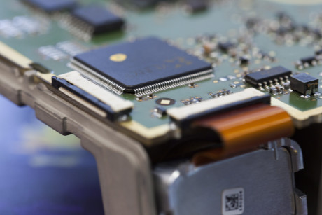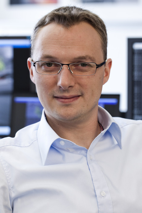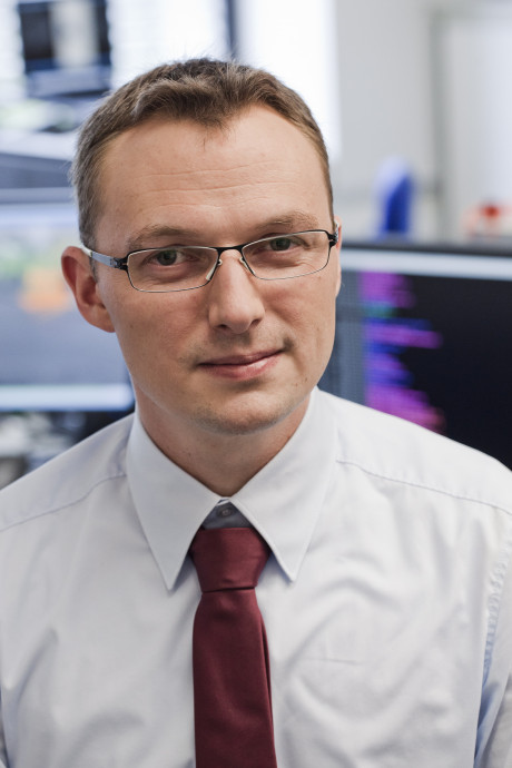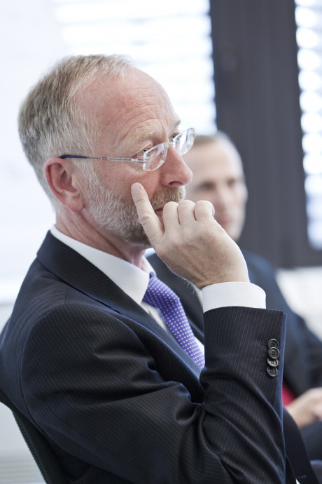 Ergebnis des 6D-Vision Verfahrens: Die Farbe kodiert die Entfernung der analysierten Punkte von Rot (nah) über Gelb zu Grün (weit entfernt). Die Pfeile zeigen auf die prädizierte Position in 0,5 Sekunden. Von links nach rechts: Dr.-Ing. Clemens Rabe, Dr. rer. nat. Stefan Gehrig, Dr.-Ing. Uwe Franke.