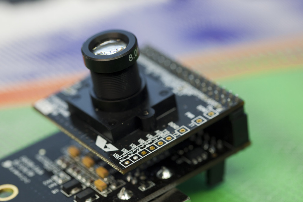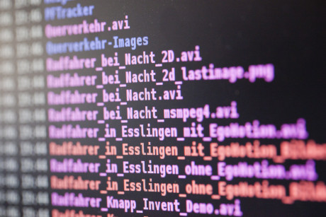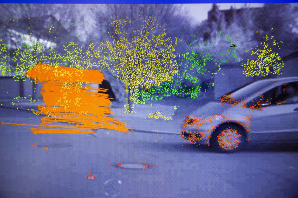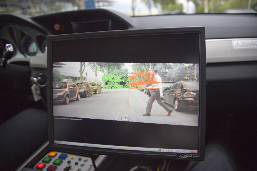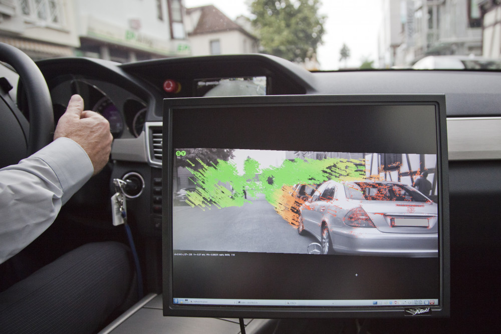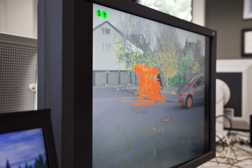 Visualisierung des 6D-Vision Algorithmus am Arbeitsplatz der Forscher. Die Farbe kodiert die Entfernung der analysierten Punkte von Rot (2m) zu Grün (50m). Die Pfeile zeigen auf die prädizierte Position in 0,5 Sekunden.