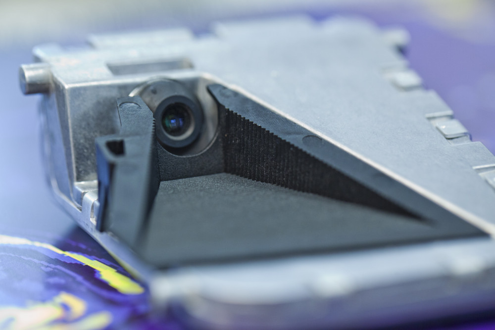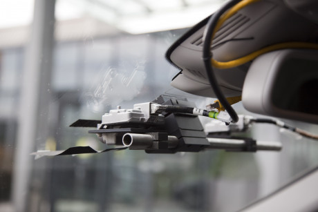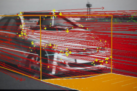 Objektdetektion auf Basis des 6D-Vision Algorithmus. Die Pfeile zeigen auf die prädizierte Position in 0,5 Sekunden. Der erwartete Fahrkorridor des Fahrzeugs ist in Orange dargestellt.