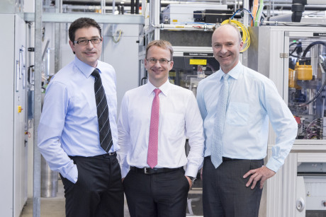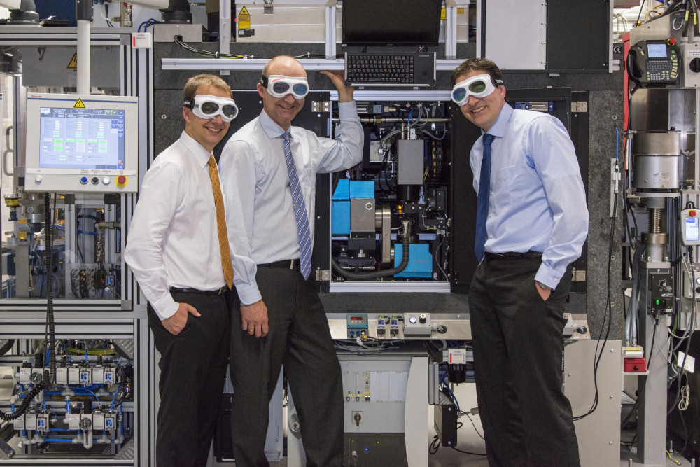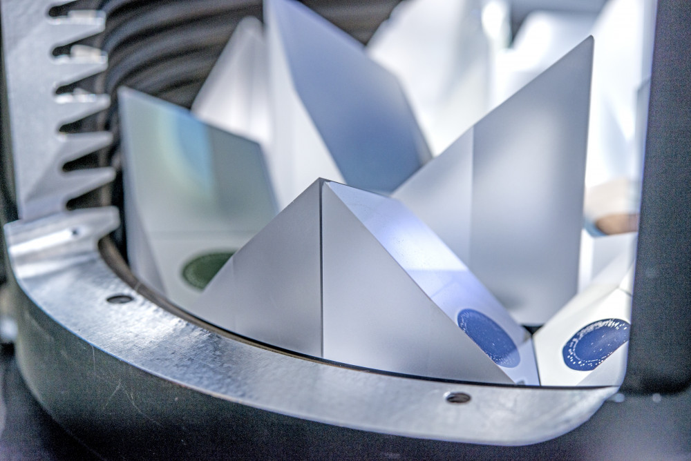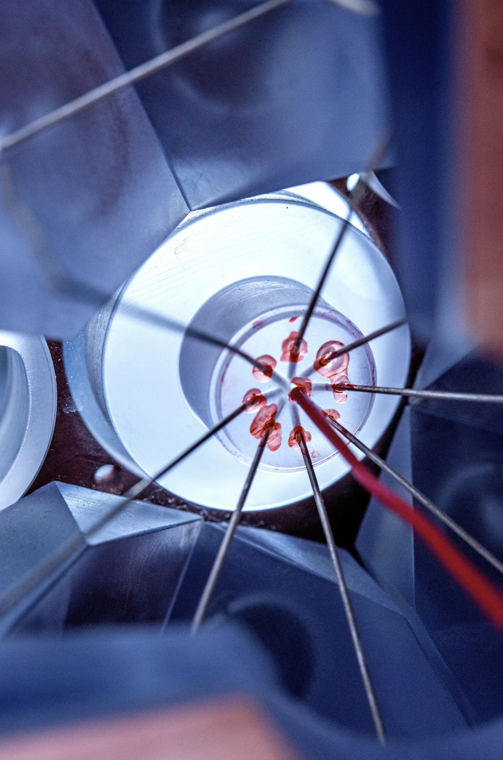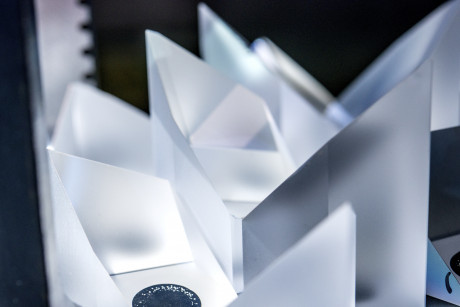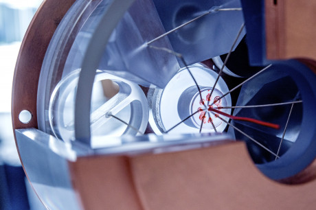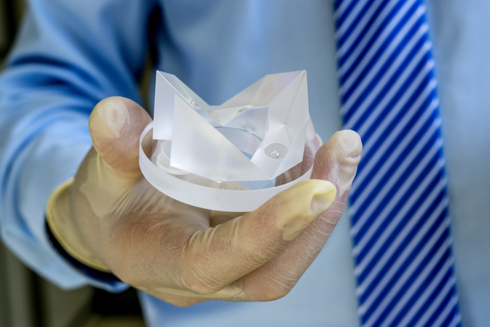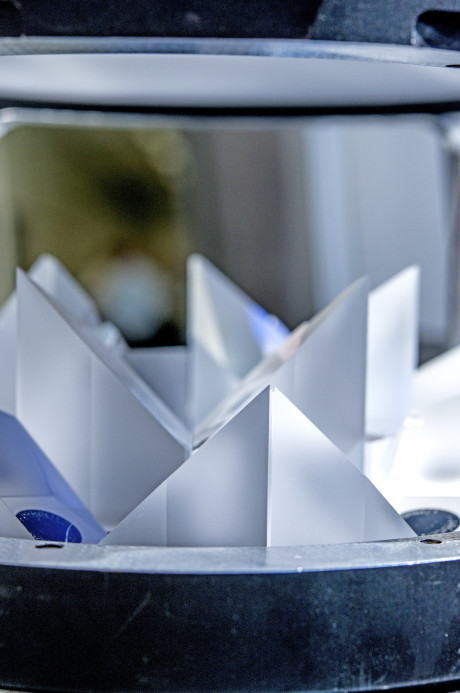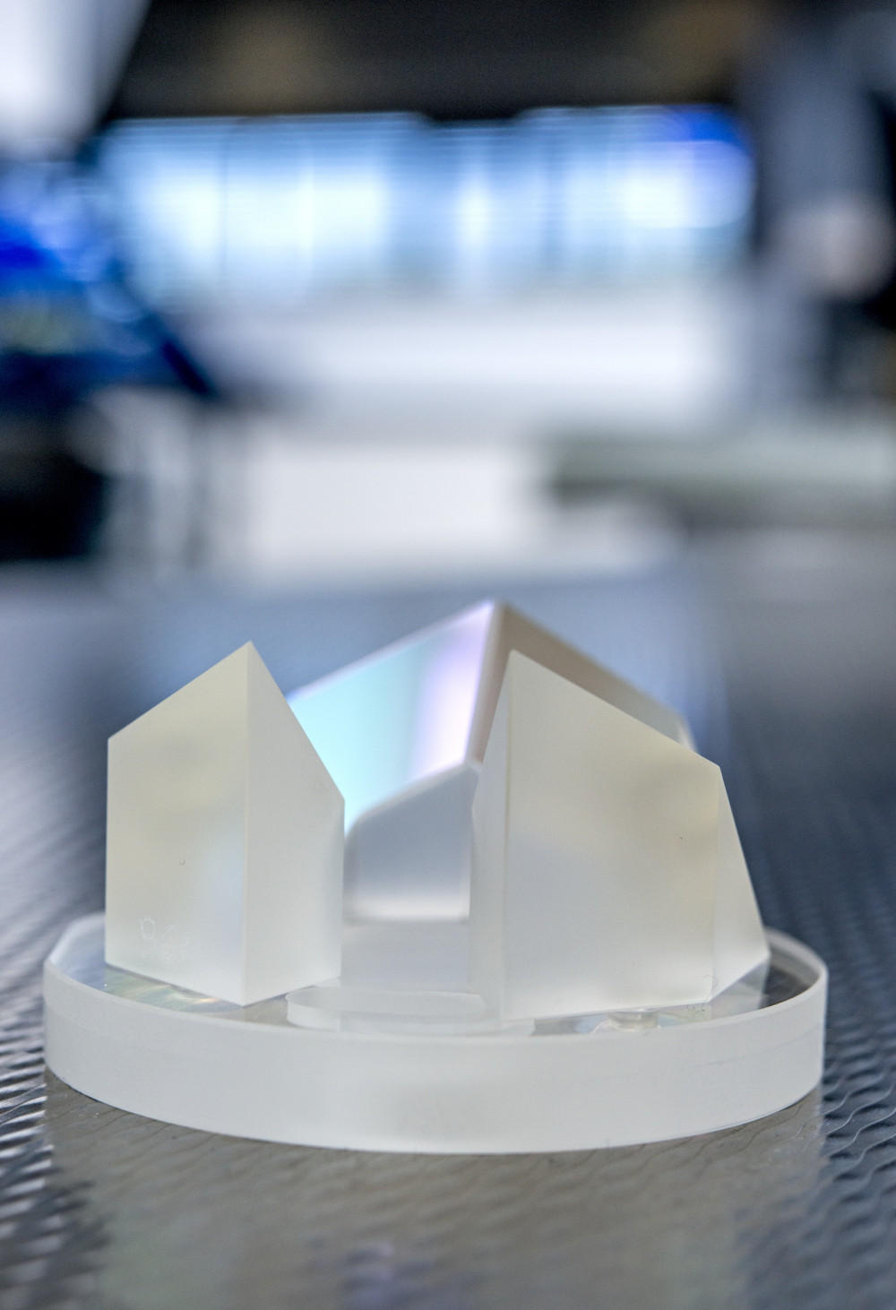Museale Darstellung einer historischen Pumplicht-Anordnung mit vierfacher Reflexion an der Laserscheibe aus dem erste Ultrakurzpuls-Förderprojekt von Trumpf (der silberne Draht illustriert den Strahlengang des Pumplichts über die symbolisierte Laserscheibe für insgesamt 16 Pumplichtdurchgänge).
