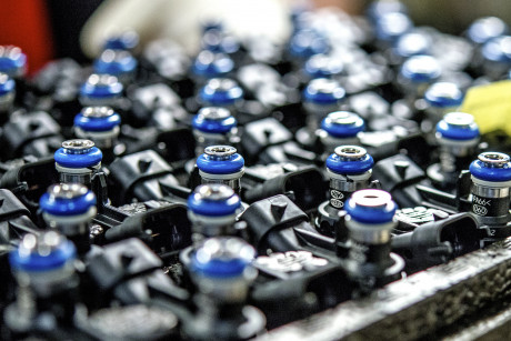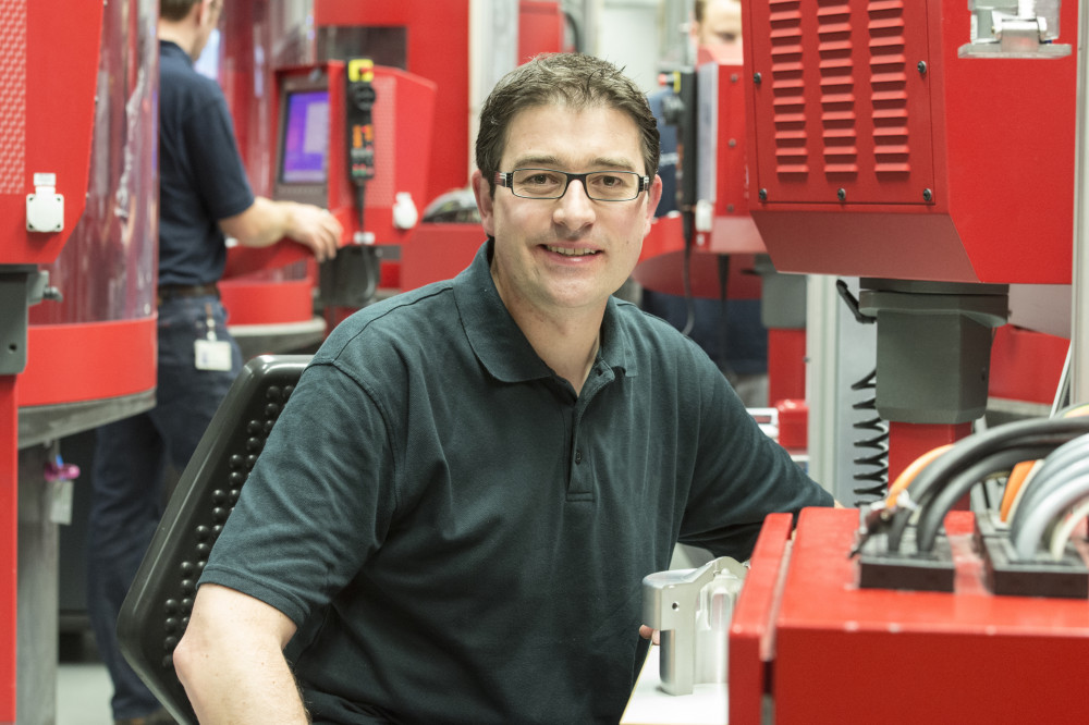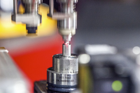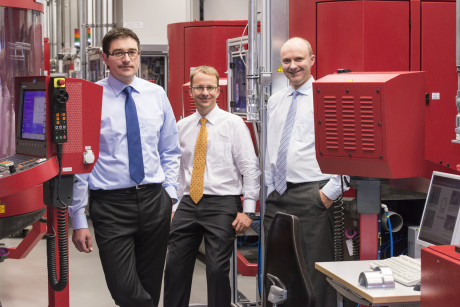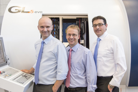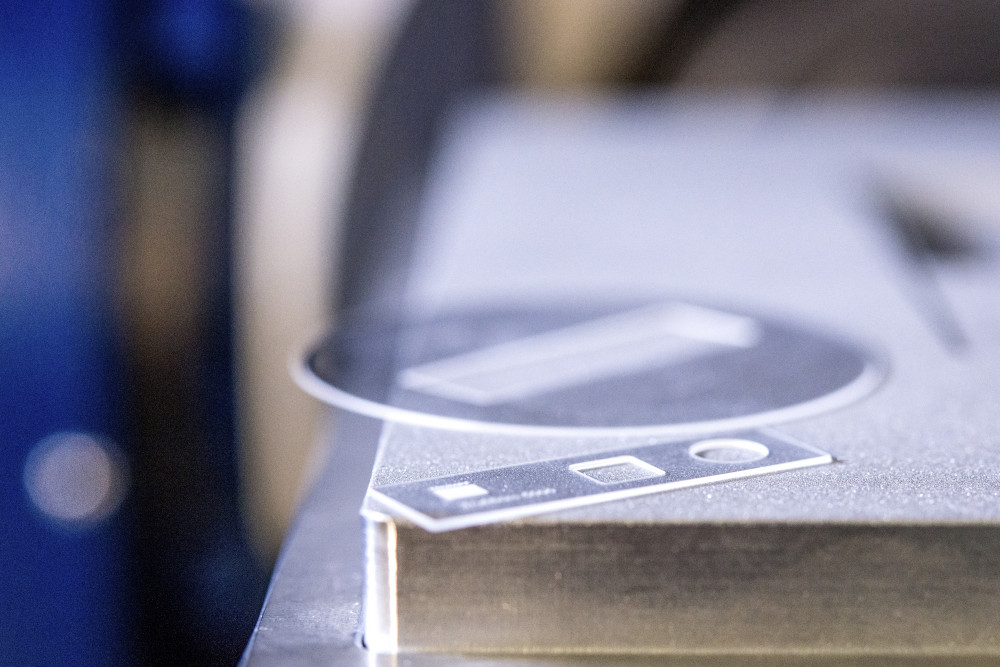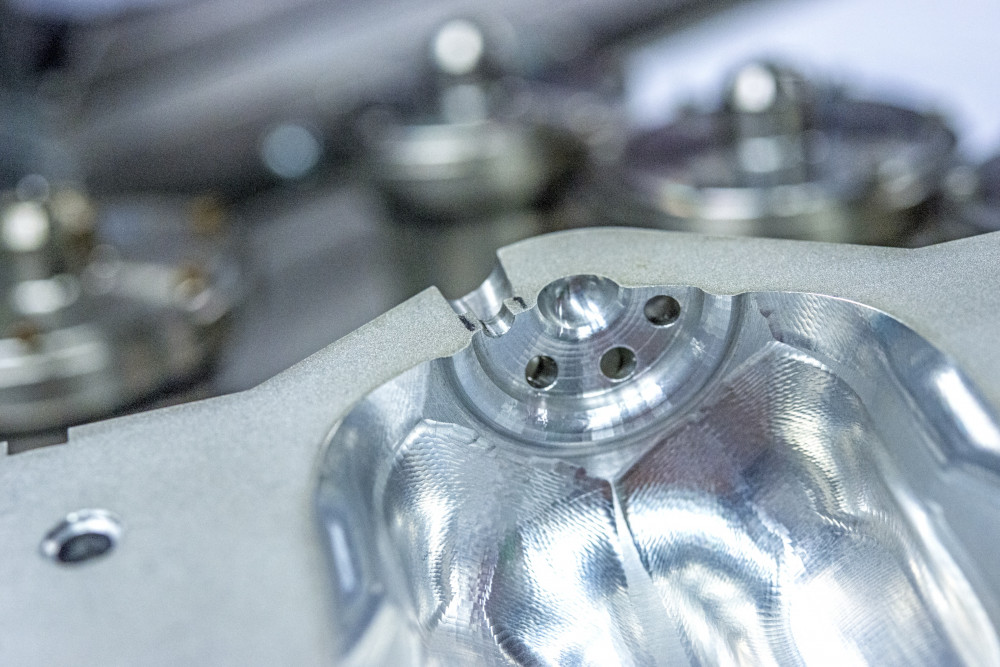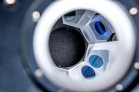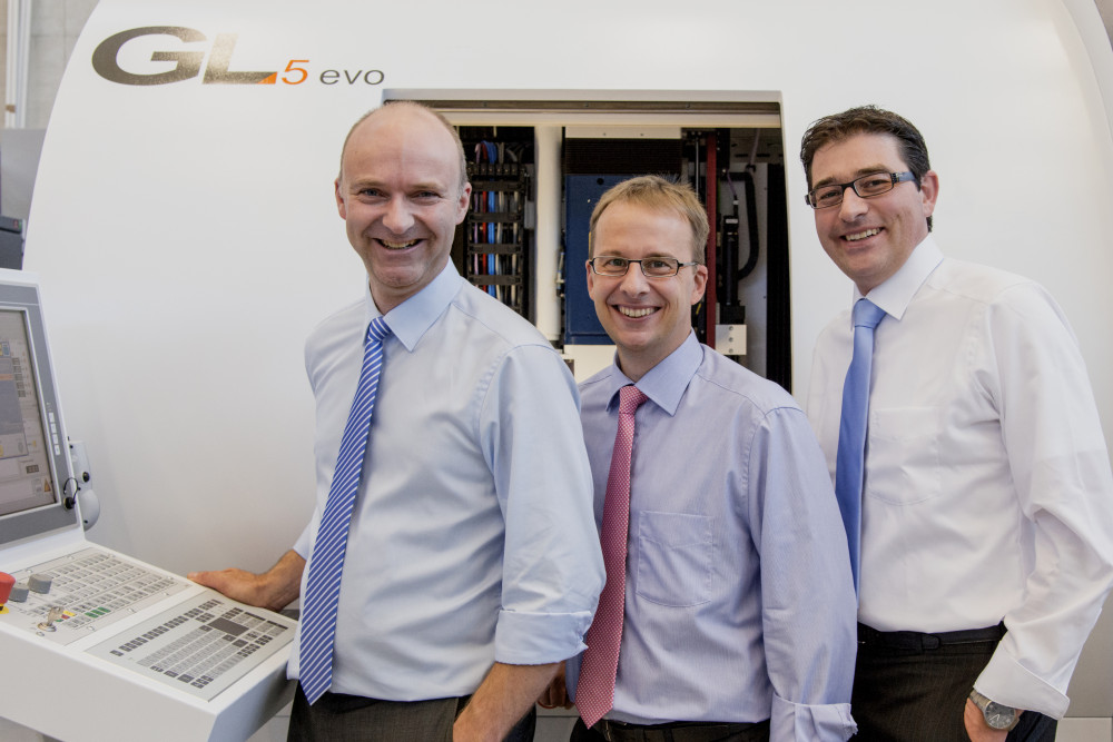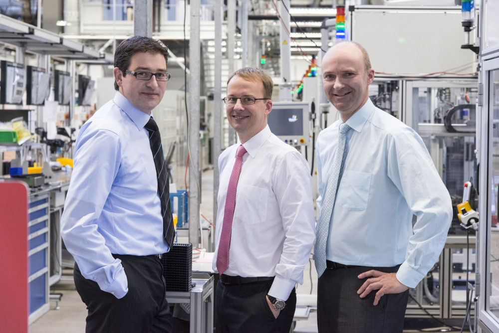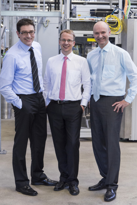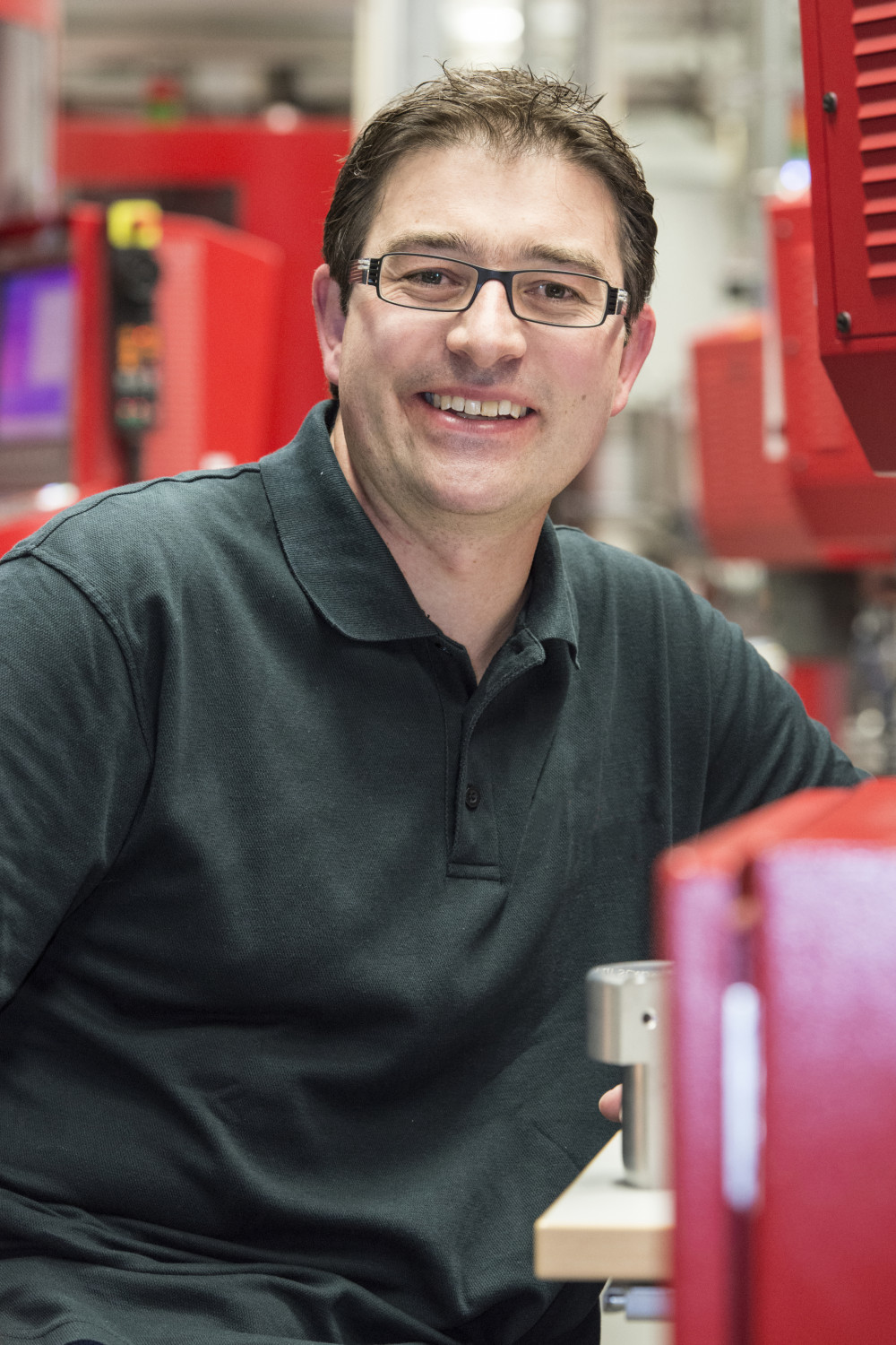 Museale Darstellung einer historischen Pumplicht-Anordnung mit vierfacher Reflexion an der Laserscheibe aus dem erste Ultrakurzpuls-Förderprojekt von Trumpf (der silberne Draht illustriert den Strahlengang des Pumplichts über die symbolisierte Laserscheibe für insgesamt 16 Pumplichtdurchgänge).