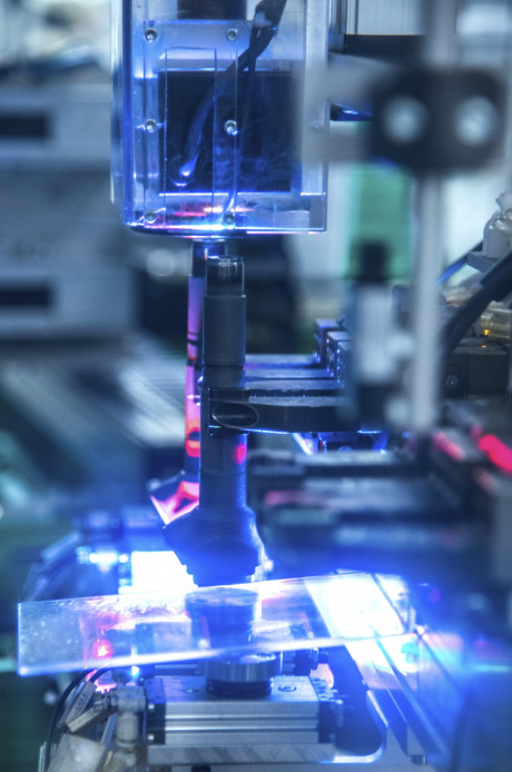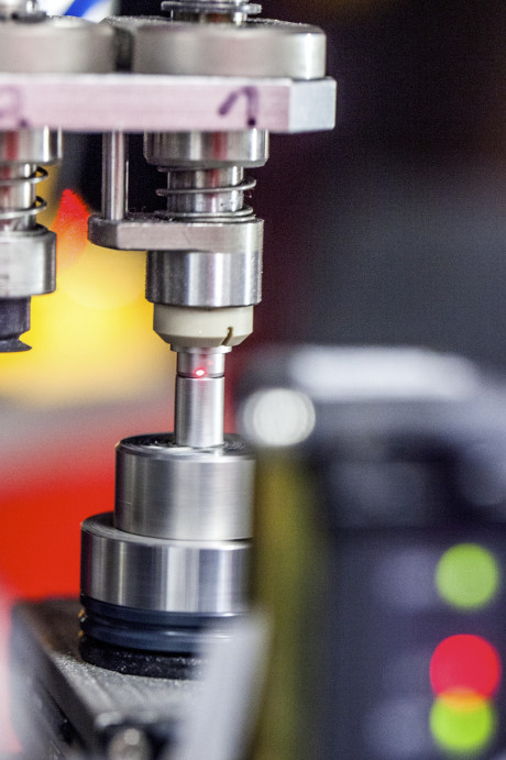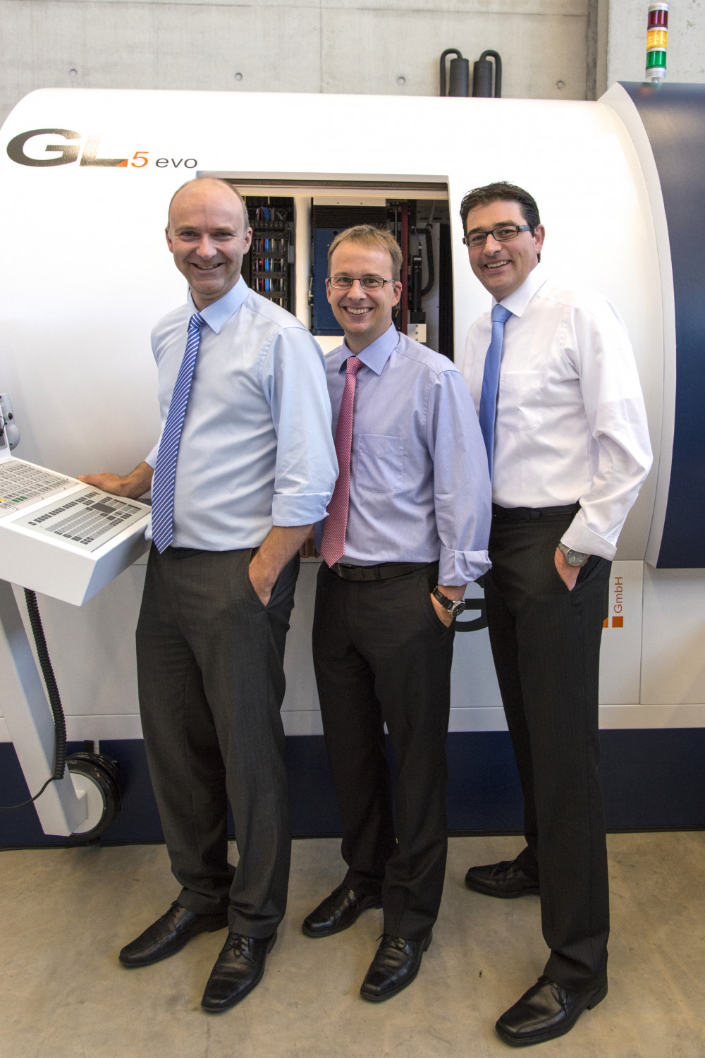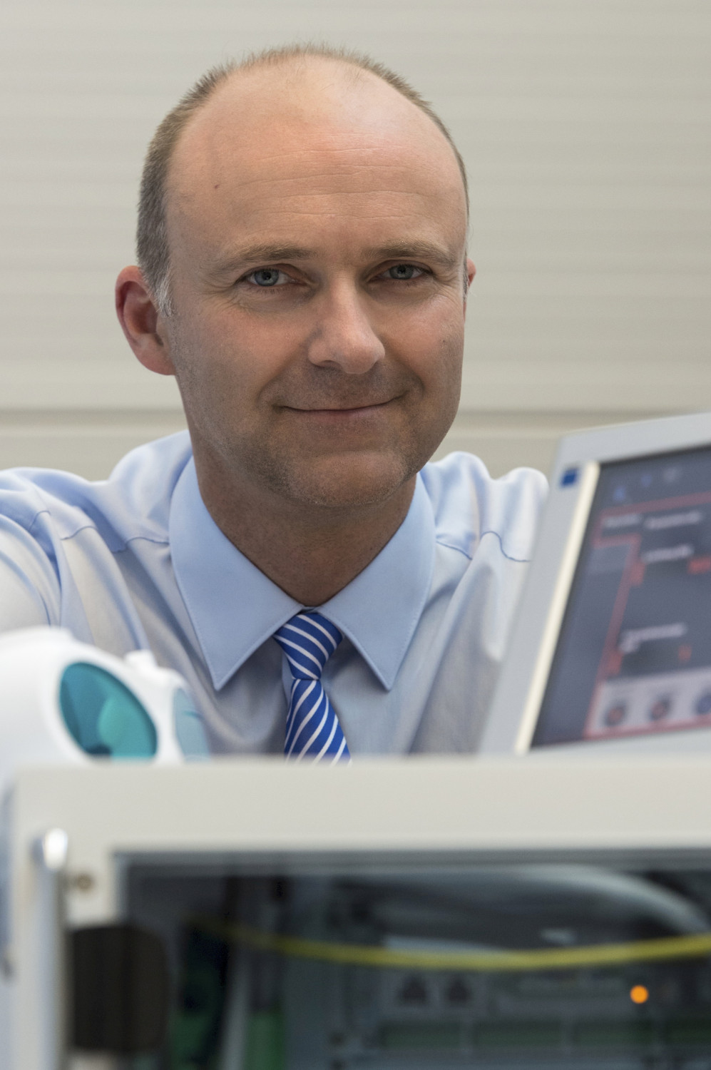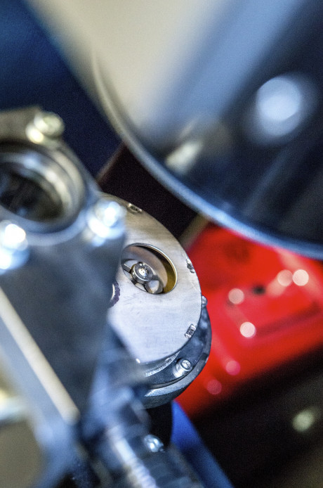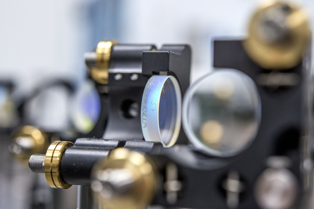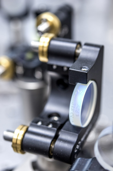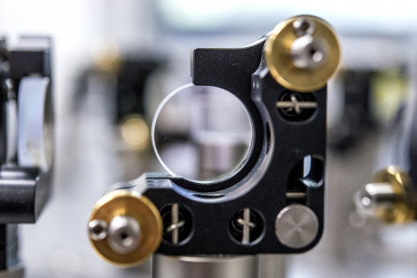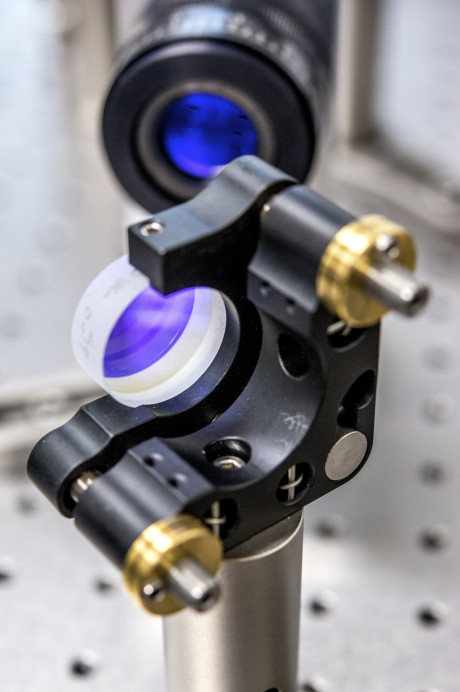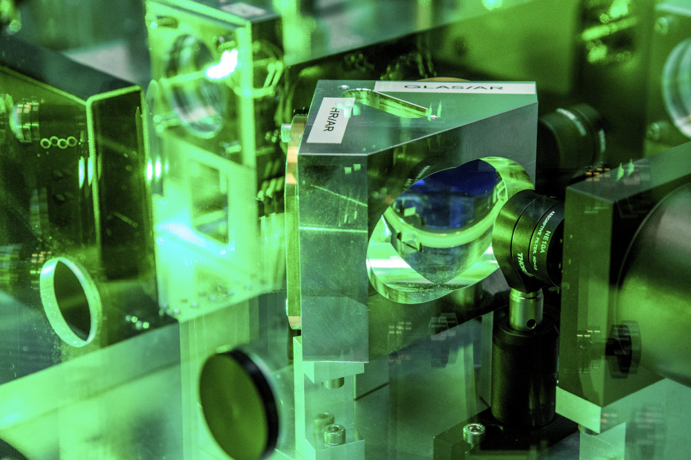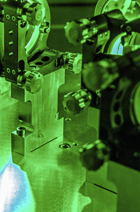 Historische Scheibenlaser-Pumpanordnung aus dem ersten Ultrakurzpuls-Förderprojekt von Trumpf (der silberne Draht illustriert den Strahlengang des Pumplichts über die symbolisierte Laserscheibe).