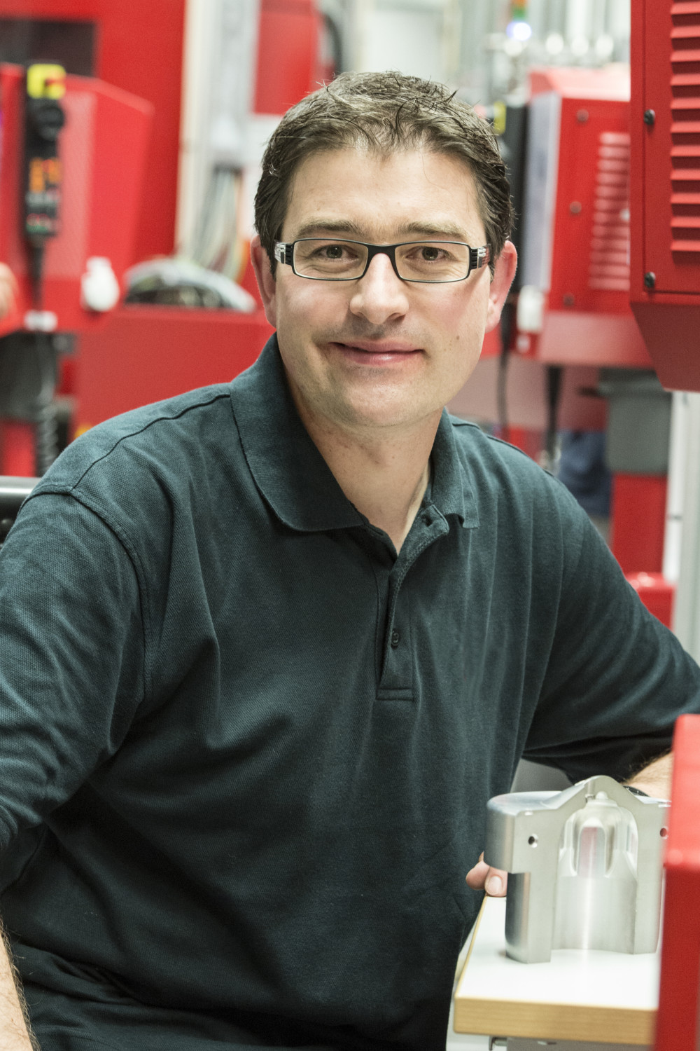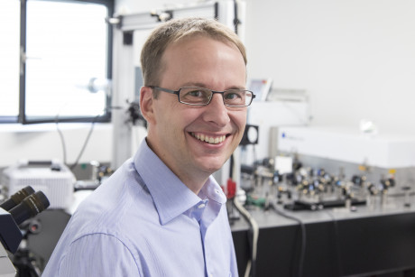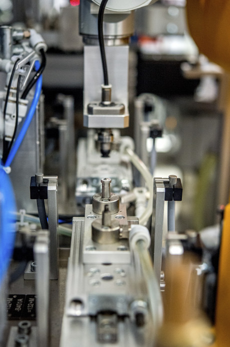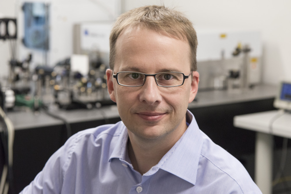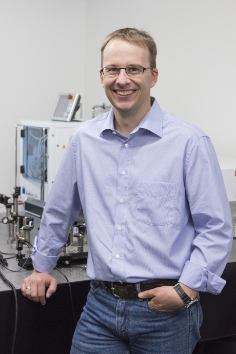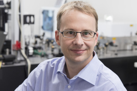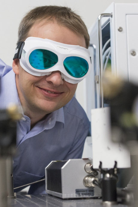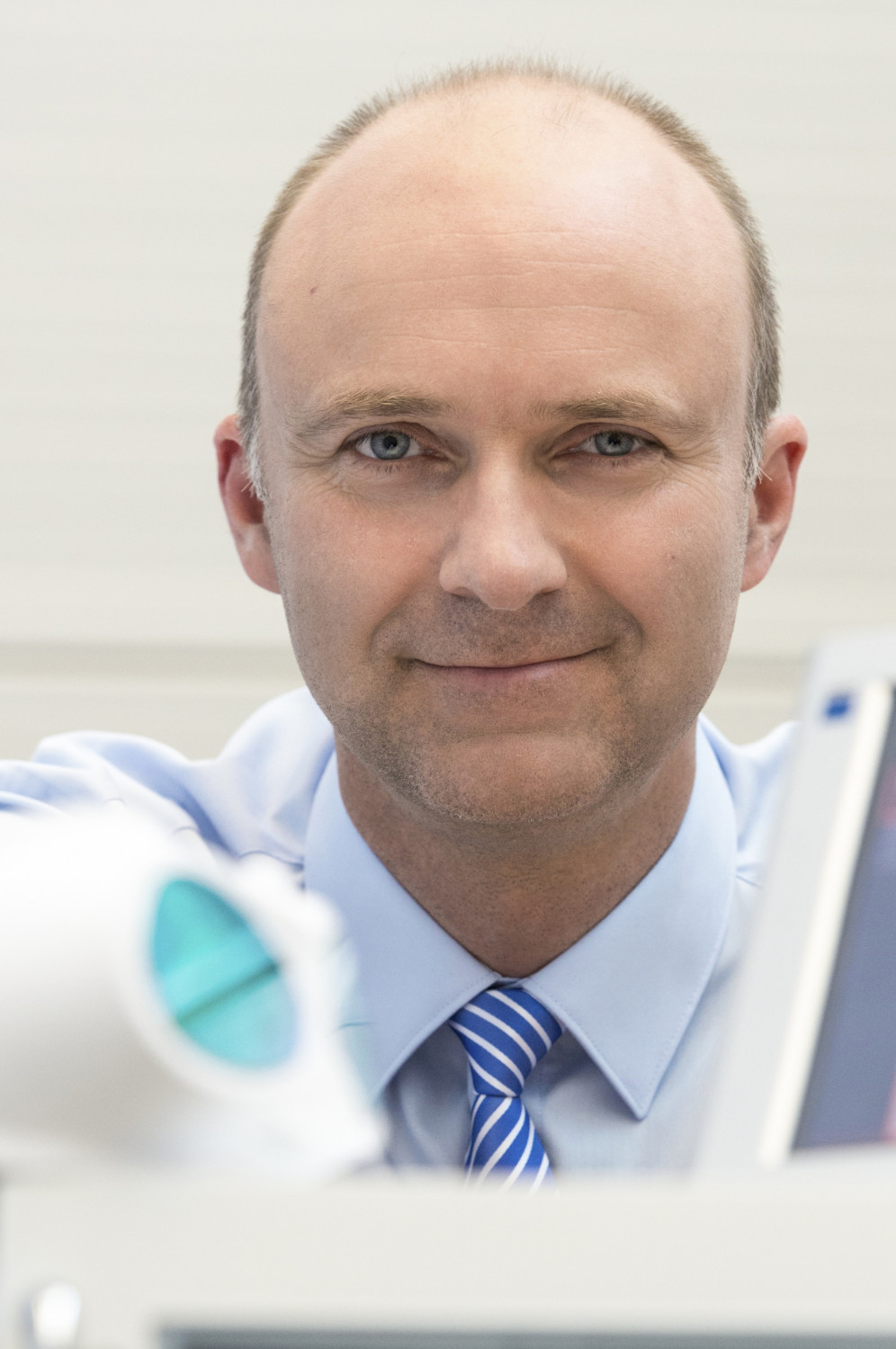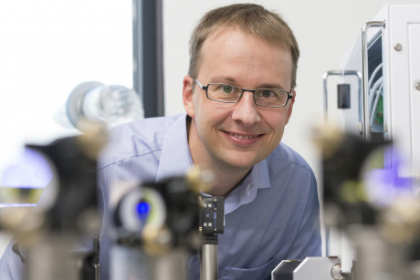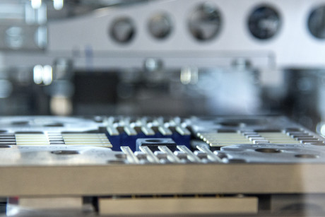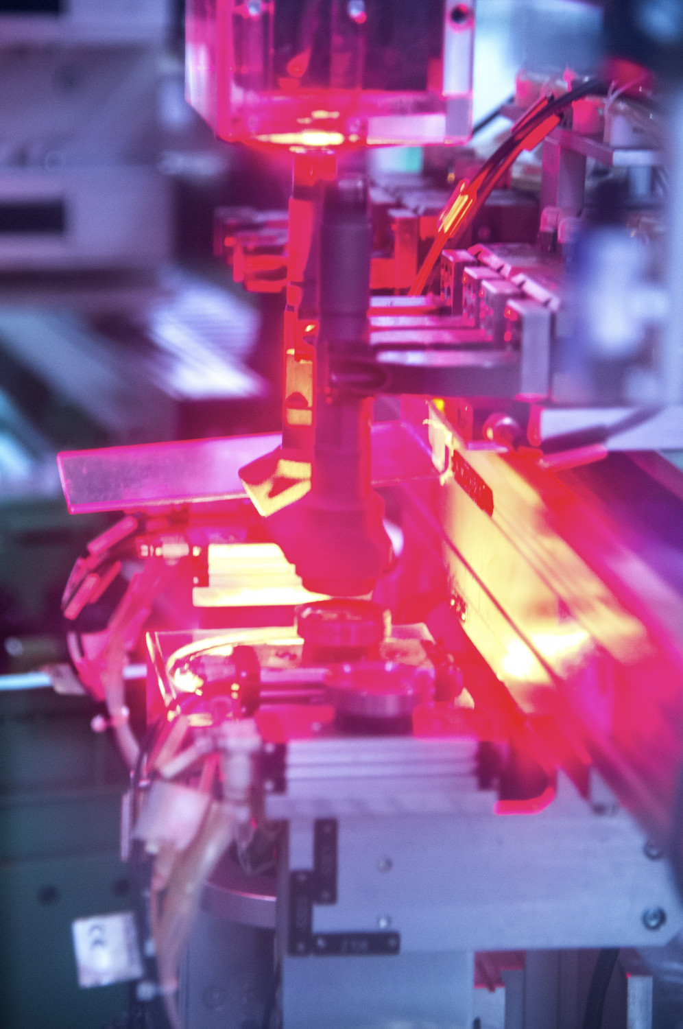 Historische Scheibenlaser-Pumpanordnung aus dem ersten Ultrakurzpuls-Förderprojekt von Trumpf (der silberne Draht illustriert den Strahlengang des Pumplichts über die symbolisierte Laserscheibe).