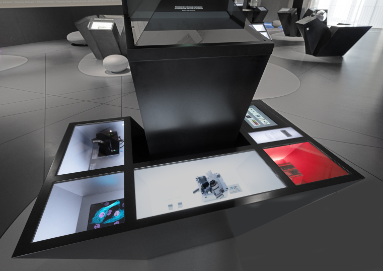 A demonstration, in this case, blood cells magnified 3,300 times, explains the principle of lightsheet microscopy: first, by means of the planar illumination of all cells and, second, by means of lasers that illuminate the individual planes of these cells. This prevents the cells from being damaged by the laser light while still making it possible to observe the brightly lit and well-focused object in focus.