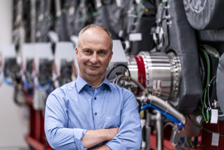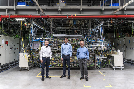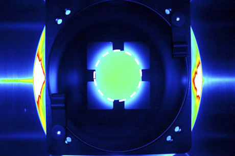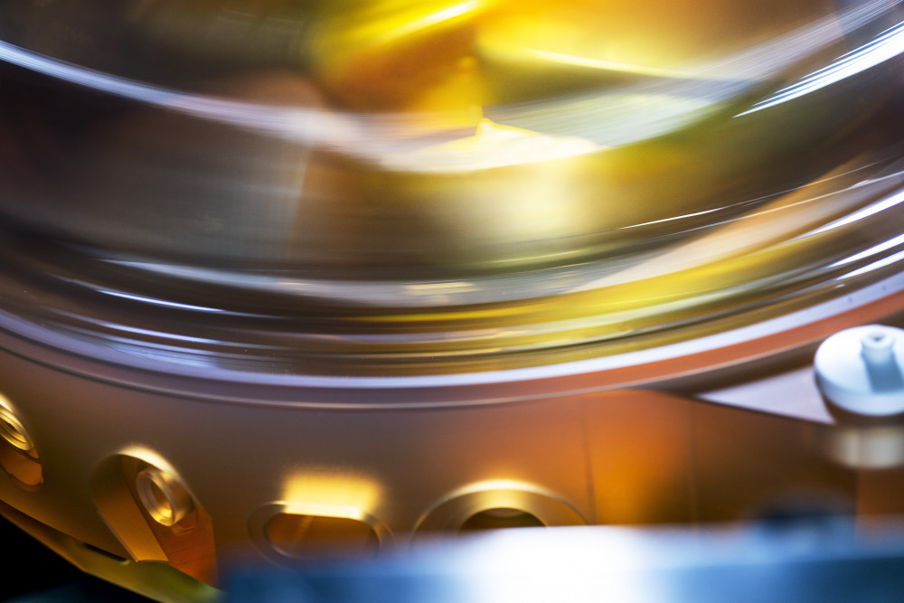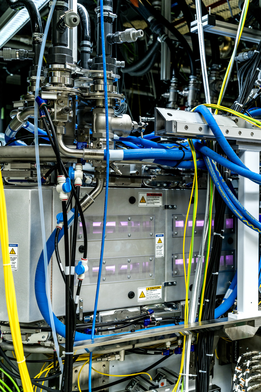 Komponente des Lasersystems für die EUV-Lichterzeugung im Betrieb (erkennbar am violetten Leuchten in den 4 Sichtfenstern)