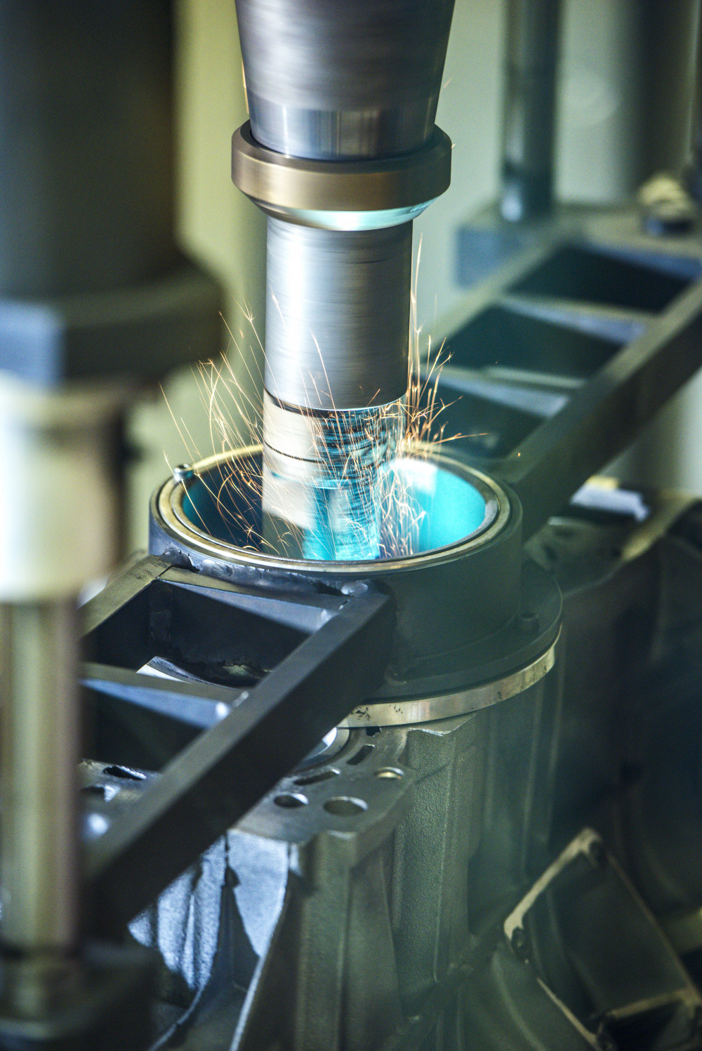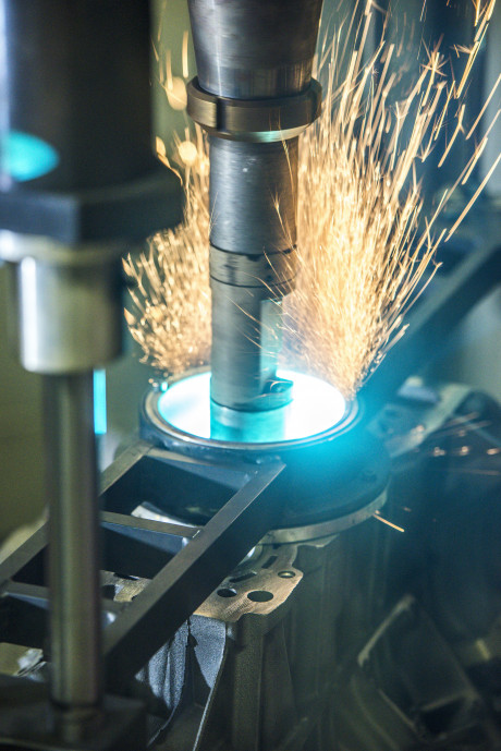 Leuchtende Spritzpartikel während der Beschichtung der Zylinderbohrungen eines Kurbelgehäuses