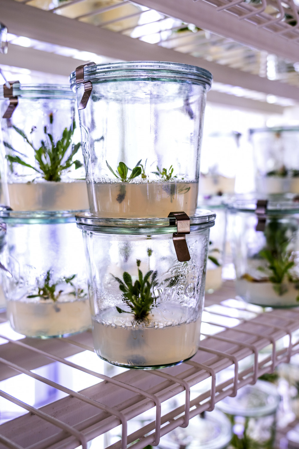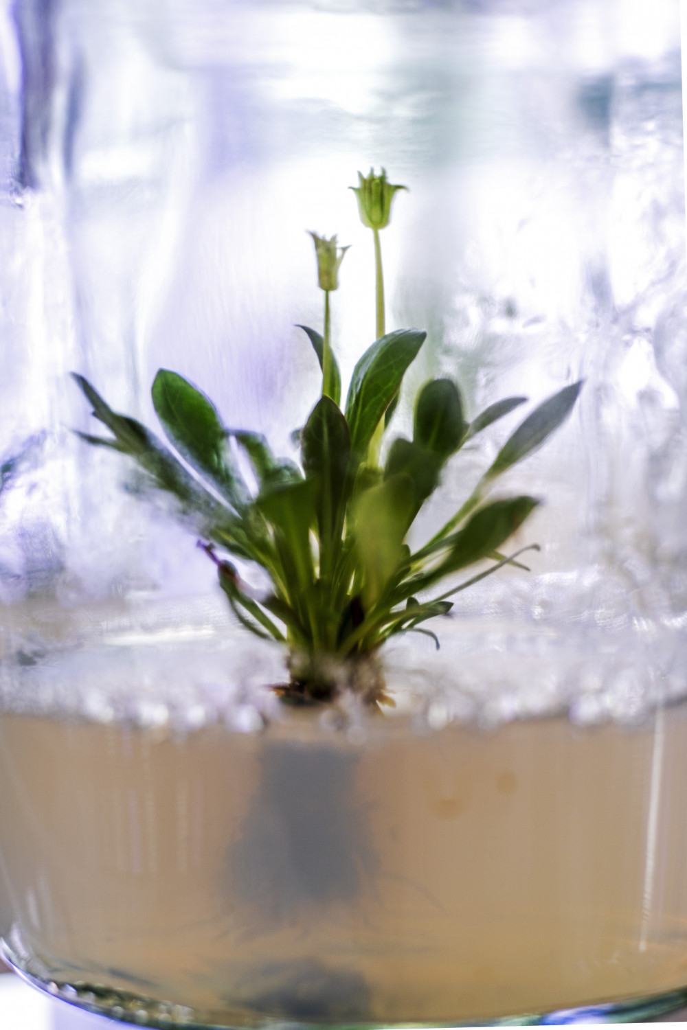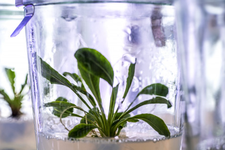Russischer Löwenzahn in Sterilkultur. Nahaufnahme der Pflanze im Nährmedium