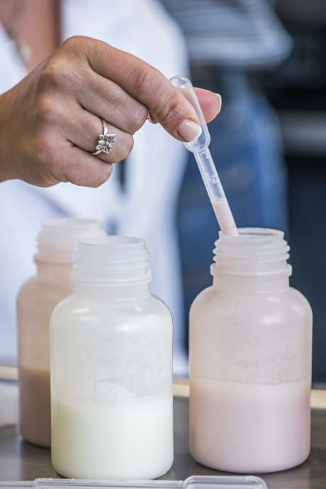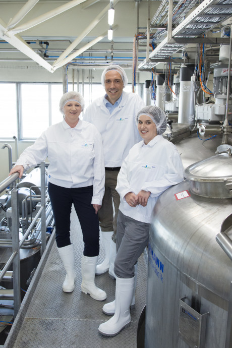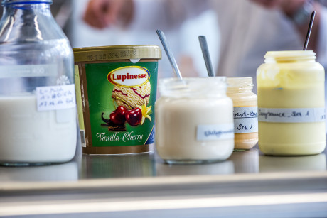 Verschiedene Lupinenprodukte (v.l.n.r. Lupinenmilch, Speiseeis, Feinkostsaucen