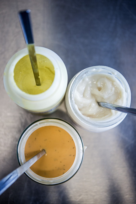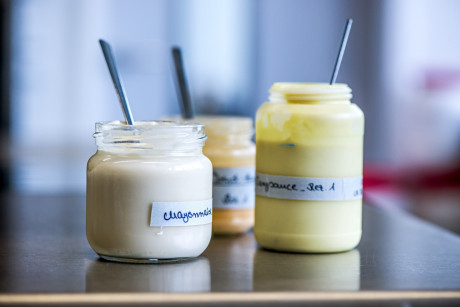 Vegane Feinkostsaucen mit Lupinenprotein (Currysauce, French-Dressing und Mayonnaise v.l.n.r.)